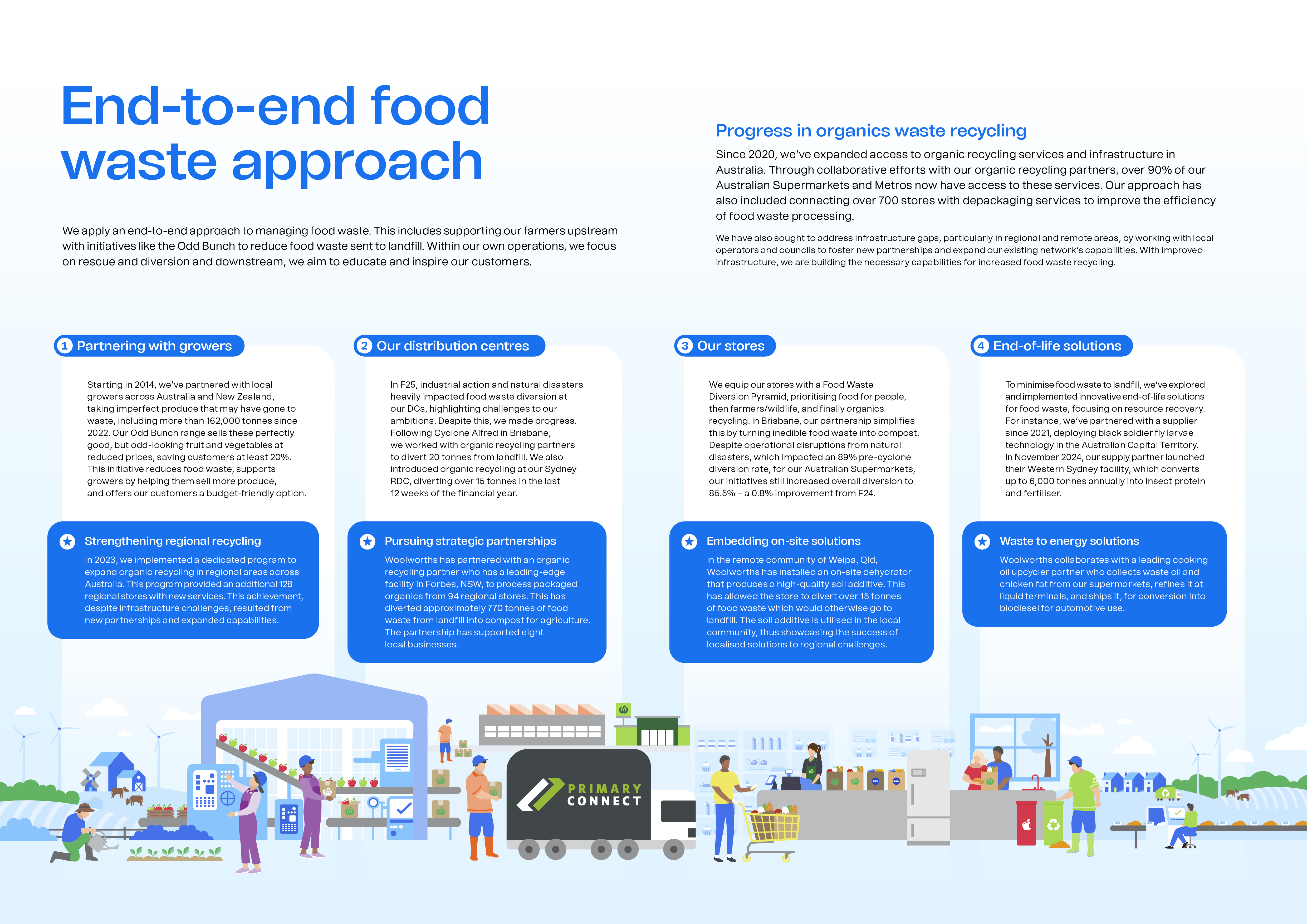 We’re transitioning our own brand bread bags to use 30% recycled soft plastic, taking the mass balanced approach, which allows soft plastics to be transformed into new, food-grade packaging. This packaging started appearing on shelves in June 2025 across selected own brand bread products, and will save approximately 50 tonnes of virgin plastic annually.